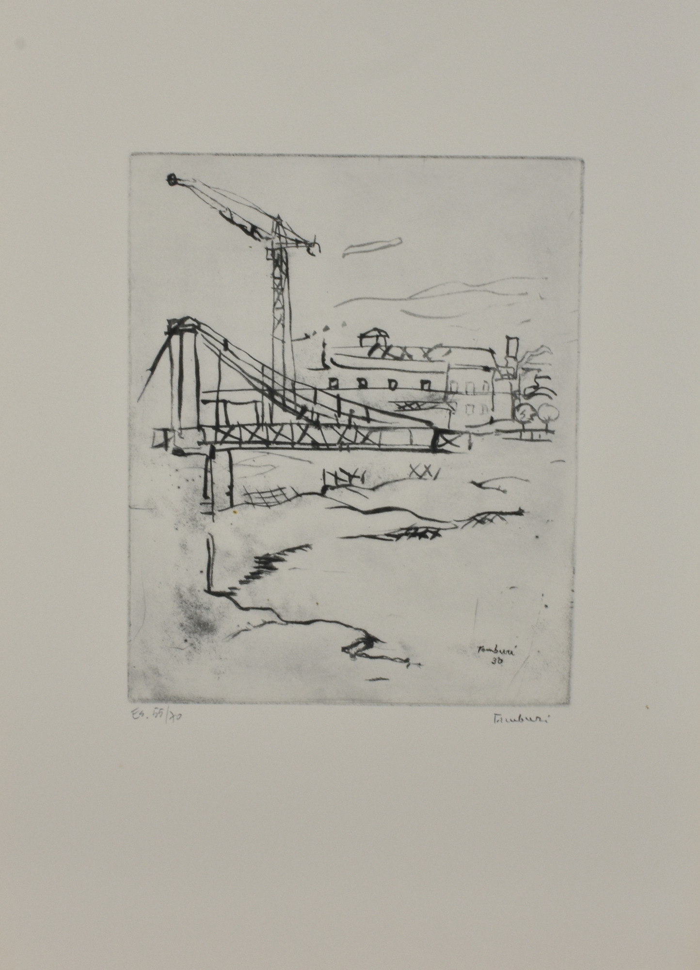 Orfeo Tamburi CANTIERE acquaforte su carta, cm 49x36 (lastra cm 27x22) esemplare 55 di 70 sul fronte: firma e timbro a secco "Luigi De Tullio Stampatore"