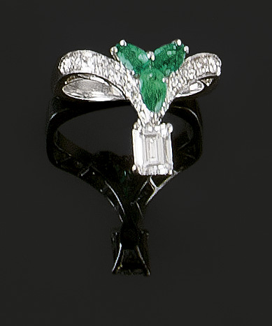 FASANO Anello in oro bianco firmato "Fasano", con tre smeraldi taglio a goccia, diamanti taglio rotondo per complessivi ct 0,40 ca e un diamante taglio brillante rettangolare di ct 0,45 ca Peso gr. 5,2 Misura 14