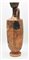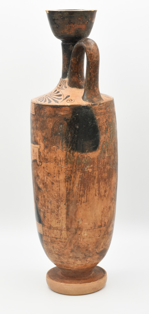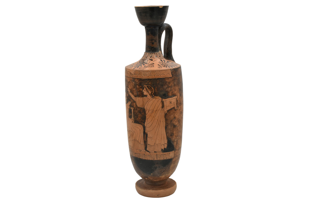 LEKYTHOS ATTICA A FIGURE ROSSE DATAZIONE: fine V SEC. A.C. MATERIA E TECNICA: argilla figulina arancio, vernice nera lucente con riflessi metallici, modellata a tornio veloce Bocchello di forma troncoconica rovescia, sottile collo cilindrico a profilo concavo, distinto dalla spalla appiattita, corpo ovoide rastremato verso il basso; ansa a nastro impostata verticalmente dal collo alla spalla, piede a disco DECORAZIONE ACCESSORIA: bocchello e esterno dell’ansa verniciati, alla base del collo kyma ionico, sulla spalla decorazione a eleganti palmette aperte a ventaglio alternativamente rivolte in alto e in basso, fra girali; parte inferiore del corpo e superiore del piede verniciate; sopra e sotto la scena figurata motivo a meandro continuo sinistrorso, orlo e parte inferiore del piede risparmiati DECORAZIONE: scena d‘interno: a sinistra un uomo anziano, barbato e calvo, assiso su uno scranno e completamente avvolto nel mantello, un bastone nella mano sinistra, solleva la destra verso una giovane donna in piedi di fronte a lui col braccio destro sollevato mentre nell’altro sostiene una cista; la giovane è avvolta nel mantello sotto al quale porta il chitone plissettato lungo fino ai piedi PRODUZIONE: ceramica attica a figure rosse STATO DI CONSERVAZIONE: integralmente ricomposta da frammenti DIMENSIONI: alt. cm 37 PROVENIENZA: Gea Arte Antica, Roma