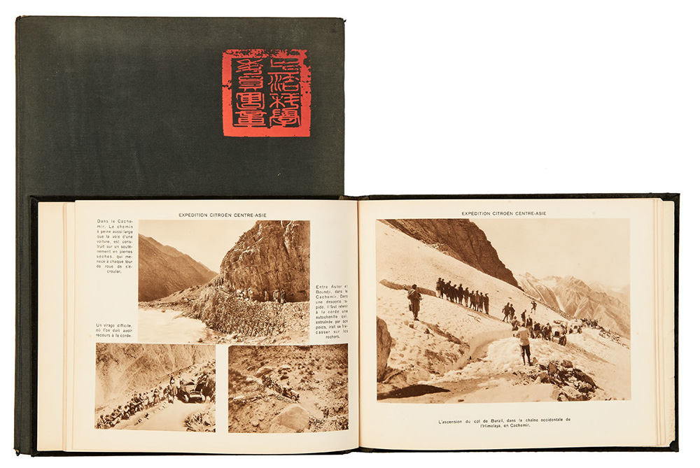 4to oblungo (210 x 269mm). 23 carte; numerose fotografie in color seppia nel testo (mancanza al margine inferiore destro della carta 22). Legatura editoriale in velluto con ideogramma cinese stampato in rosso al piatto anteriore, sguardie in oro (lievi segni d'uso). SI AGGIUNGE: Expedition Citroen Centre-Asie. 3e mission. P., L'Illustration, 1931, in-folio. (2)