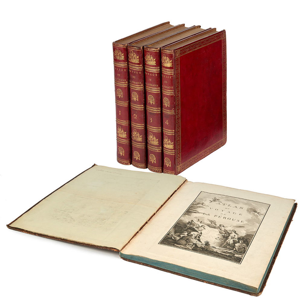 A handsome first edition on blue paper with text vols bound in red morocco of "one of the finest narratives of maritime exploration ever written" (Howell). La Pérouse, a veteran of the American Revolution and the Seven Years’ War, commanded the Astrolabe and the Boussole on a voyage of discovery into the Pacific. He disappeared at sea after setting out from Botany Bay in 1788; the ships were found wrecked on the reef of Vanikolo thirty-nine years later. This was the first French expedition to visit Alaska and the first non-Spanish European expedition to stay at the Spanish settlements in California. The voyage is especially celebrated for its superb mapping of the Alaskan and Californian coasts. Forbes 272; Hill 972; Howes L-93; Lada-Mocarski 52; Sabin 38960, Streeter sale 3493; Wickersham 6611; Zamorano 49. Half-titles, engraved title in atlas and 69 engraved plates (text without final blank, lacking engraved portrait, light occasional waterstaining; atlas with very light occasional waterstagining and few leaves lightly browned). Text vols in contemporary red morocco decorated in gilt on panels, spines and edges (in good condition, very lightly rubbed at extremities and with light waterstaining); atlas in contemporary mottled calf, blue edges (extremities lightly rubbed, small chips). Provenance: S.P. Eugenii (bookplate).