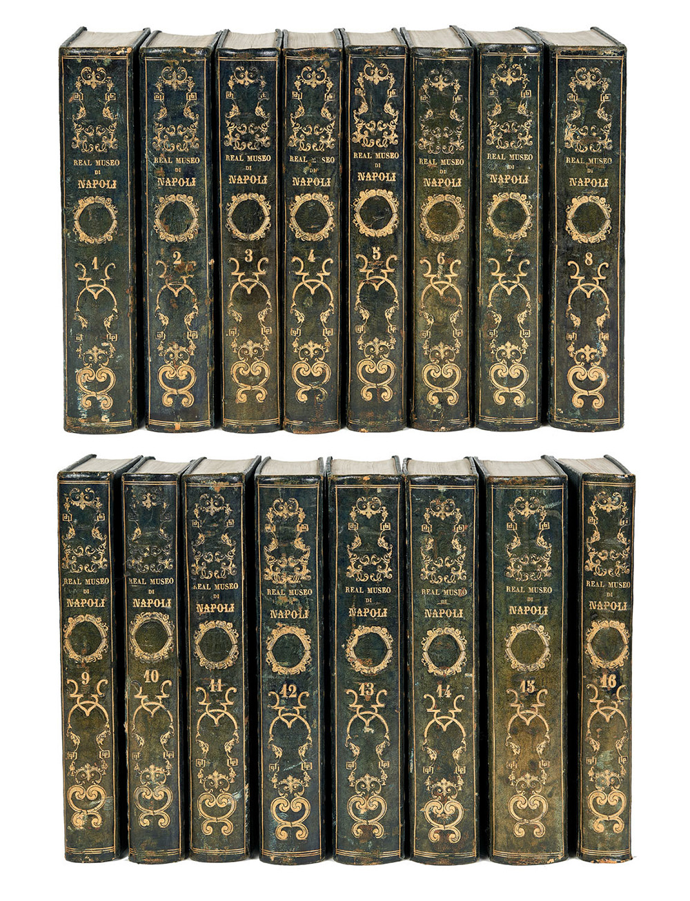 16 volumi, 8vo (274 x 190mm). I frontespizi sono in carta leggera (forse sostituiti successivamente quando il Museo divenne Nazionale), numerosissime tavole incise in rame (alcune fioriture). Legature quasi coeve con bei dorsi in marocchino verde decorati in oro (lievi tracce di usura). Il lotto si vende non passibile di storno. (16)