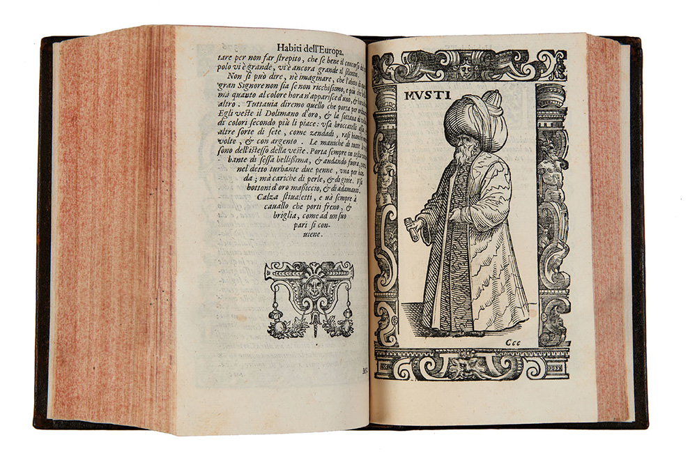 First edition of this famous early costume book with good margins and strong imprint. The woodcuts were designed by Cesare Vecillio, a relative of Titian. The first part depicts costumes mostly from Europe, including Russia, Sweden, Greece and Turkey, the second part illustrates costumes from Asia and Africa.