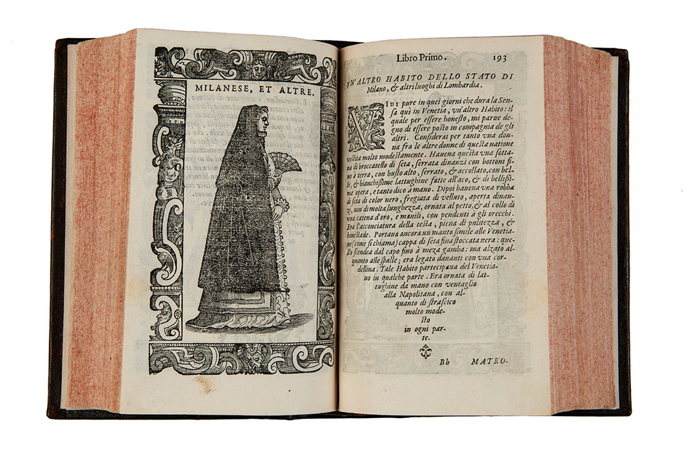 Prima edizione, esemplare con ottimi margini e inchiostratura del primo trattato sistematico sull’estetica del vestire. La grande importanza di questo celebre testo è data dalla accurata e reale rappresentazione degli abiti delle dame e di tutte le donne del mondo a quel tempo noto. Le donne vengono raffigurate non solo con i loro abiti, ma anche con i loro gioielli ed accessori caratteristici.