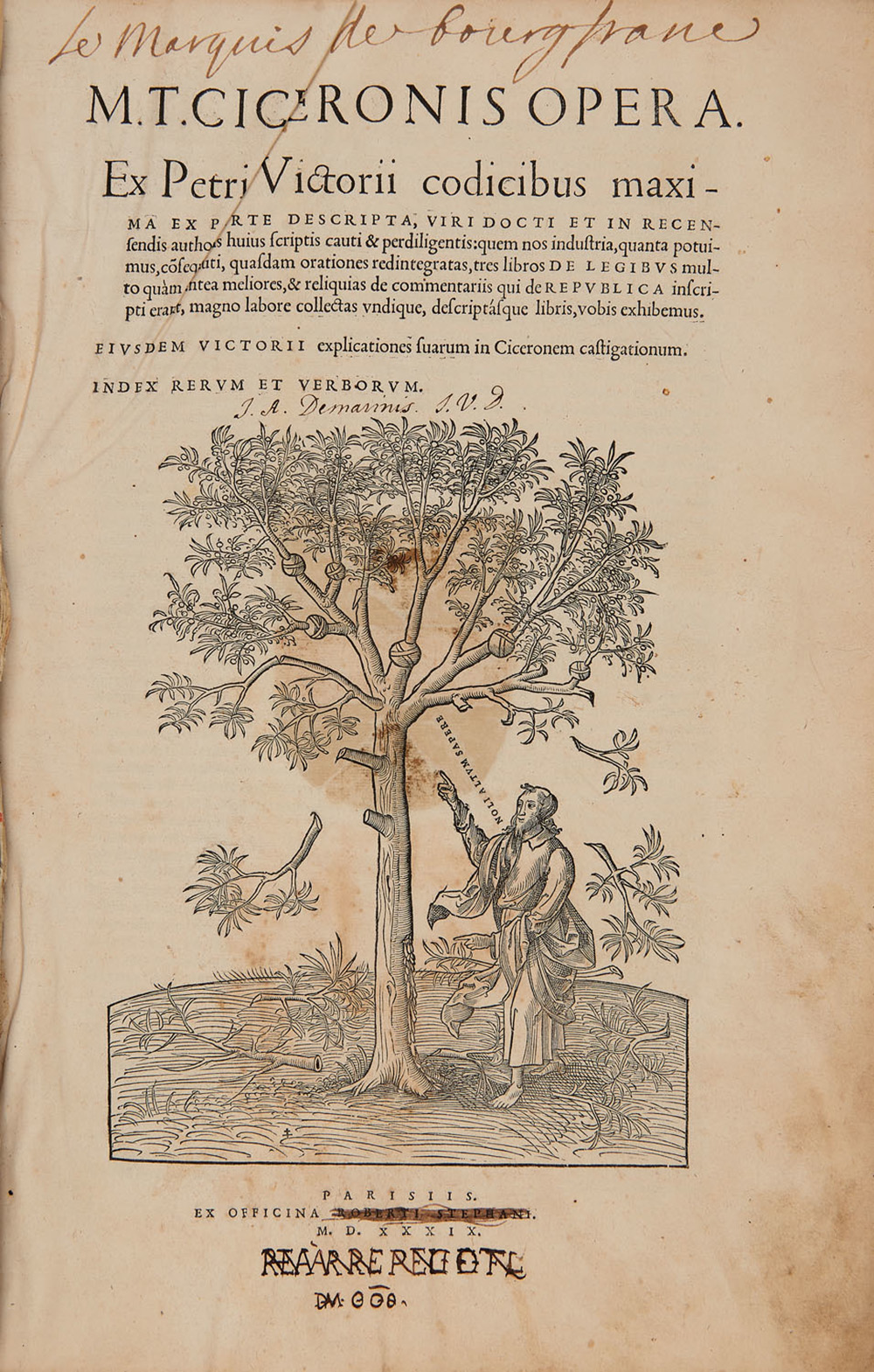 CICERONESome contemporary marginal notes, good internal contidion.18th-century armorial calf, manuscript title on spine (some wear) - Ciceronis Opera. Ex Petri Victorii codicibus maxima ex parte descripta. Paris: Stephani, 1538-39.
