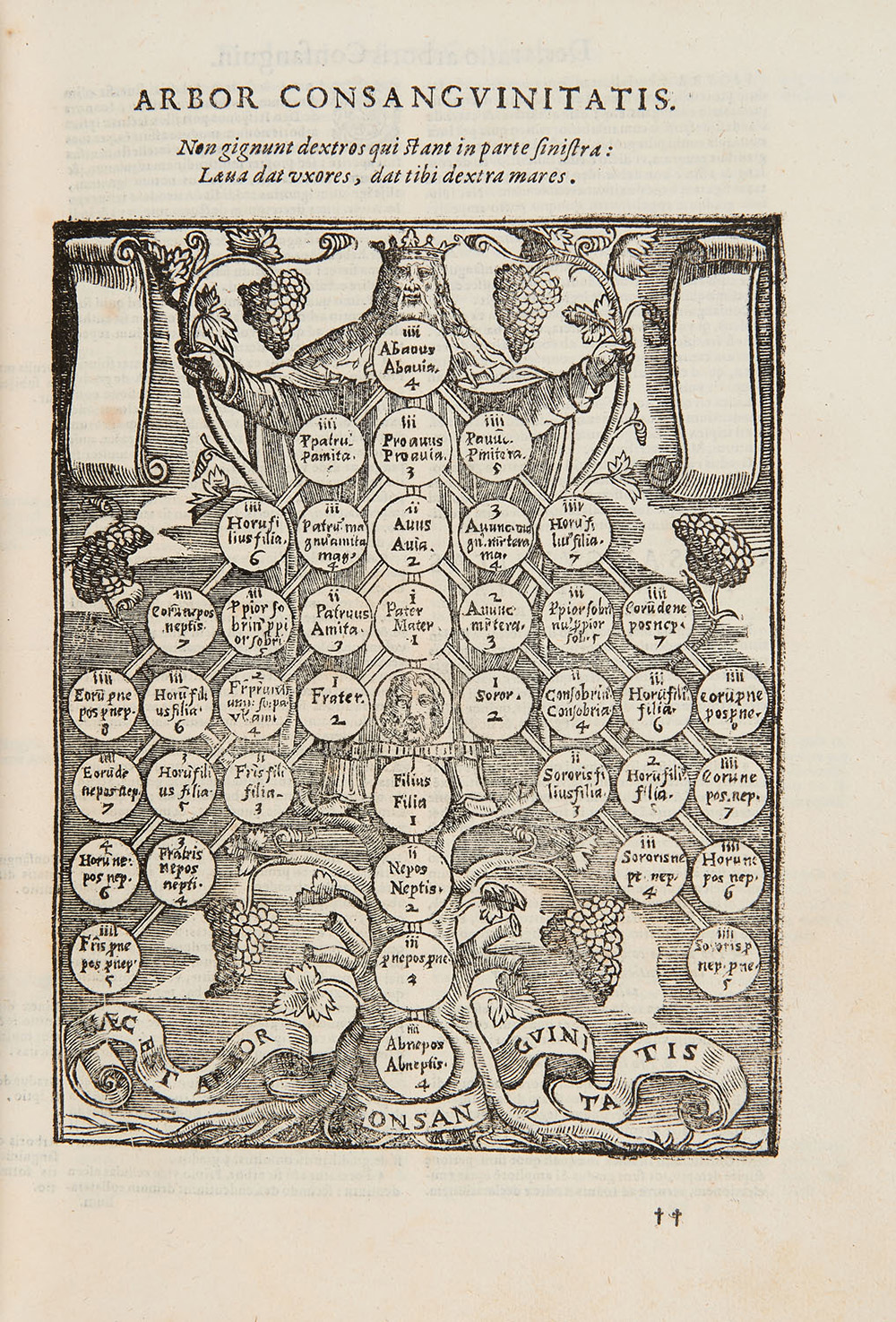 4to (244 x 172mm). Title in red and black with printer's device, woodcut initials and two large woodcuts with a genealogical tree and an affinity tree, text in red and black, with blank 2X8 (occasional light browning, few scattered stains, mainly in the margins, sometimes in text as in 4D8 and 4E1). Contemporary vellum over wooden boards (some staining and chipping). Provenance: Giovanni Passarini (ownership inscription). In the same lot also Decretum Gratiani printed in red and black in contemporary vellum over wooden boards with the same provenance (lacking part of frontispiece, sold as viewed and not subject to return). (2)