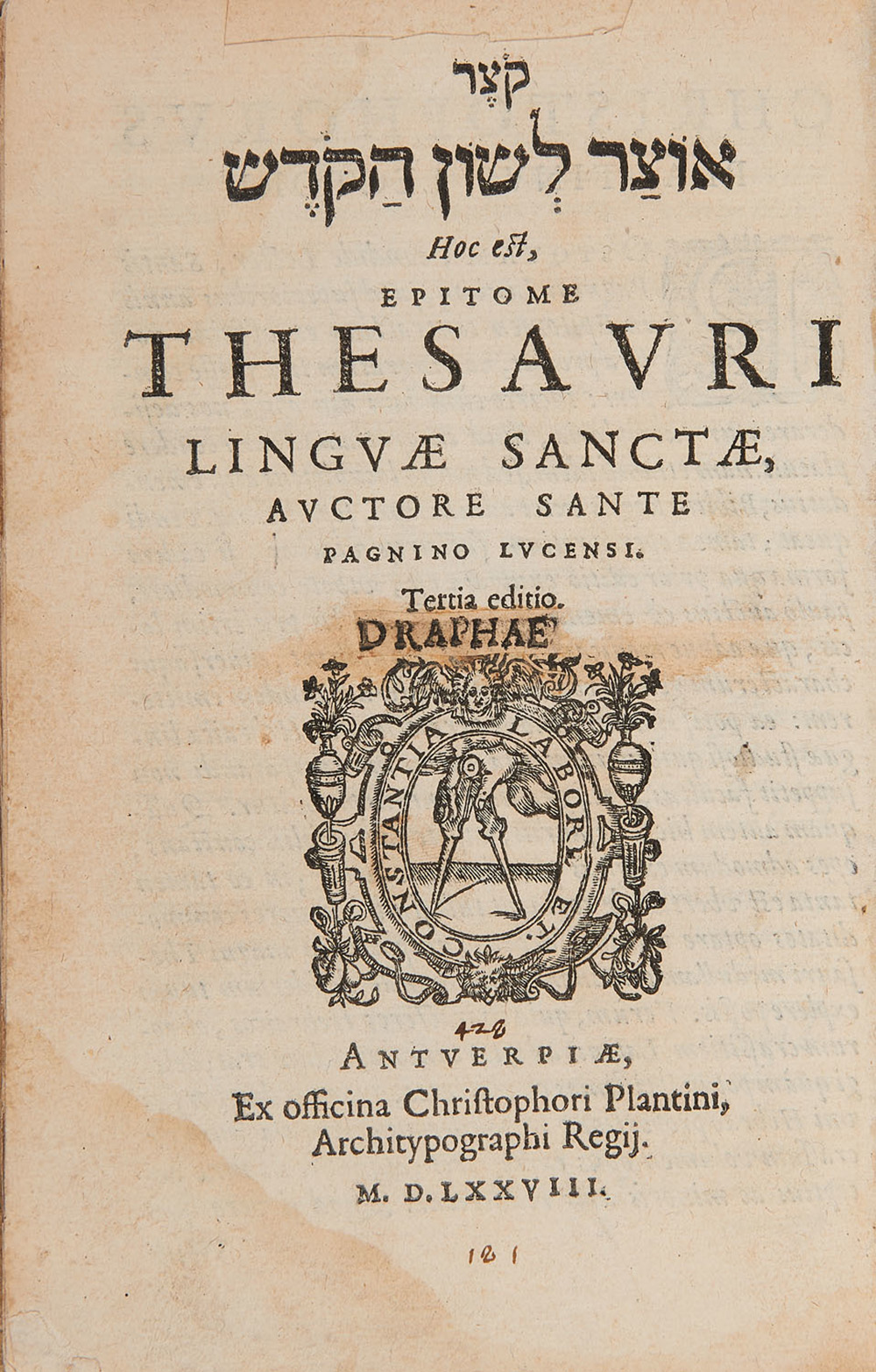[JUDAICA] - PAGNINO Sante (1470-1541) - Hoc est Epitome Thesauri Linguae Sanctae. Antwerp: Plantin, 1578.