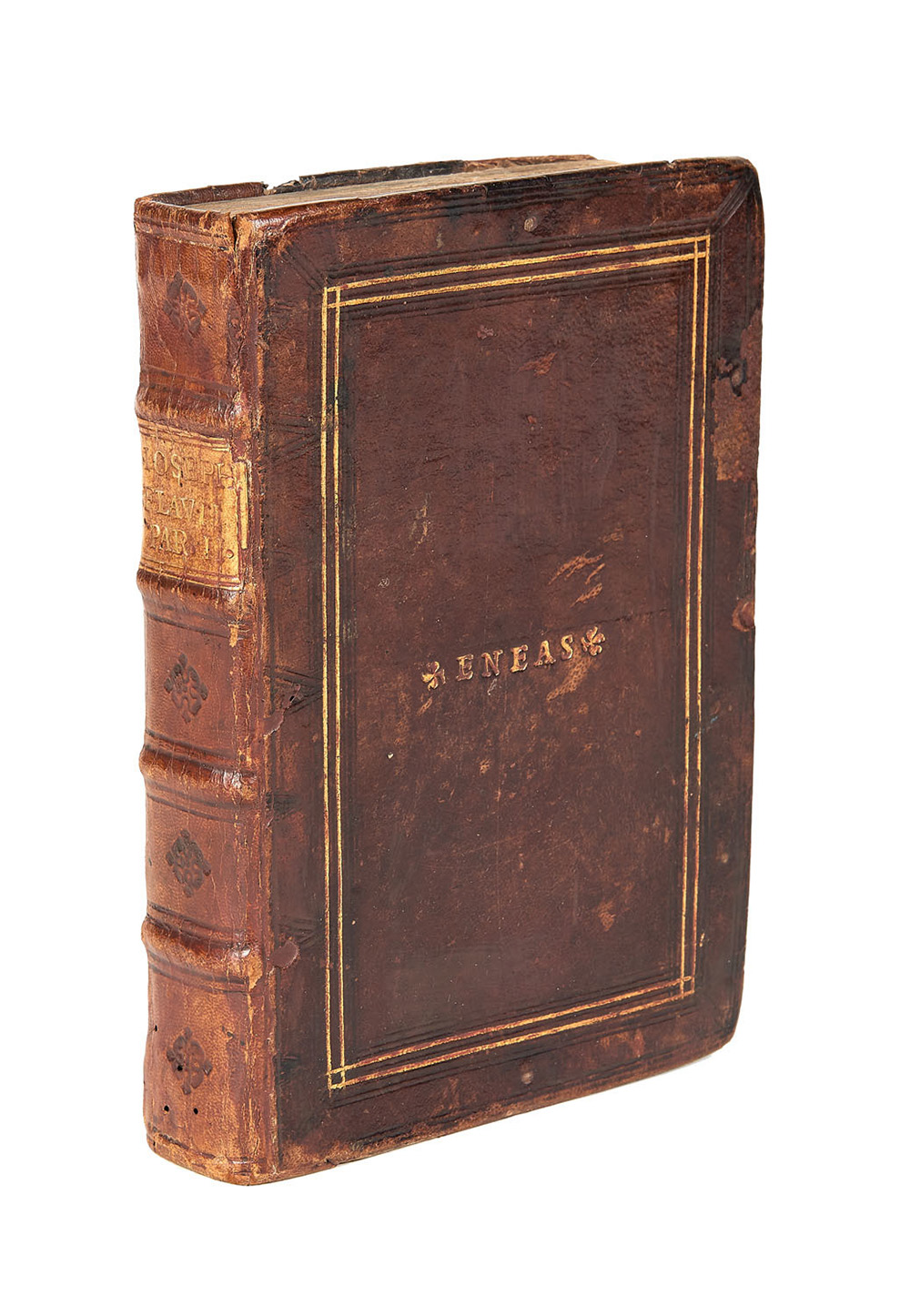 Interessante legatura in tutta pelle parlante con la scritta E N E A S al centro dei piatti circondata da 2 filetti in oro.