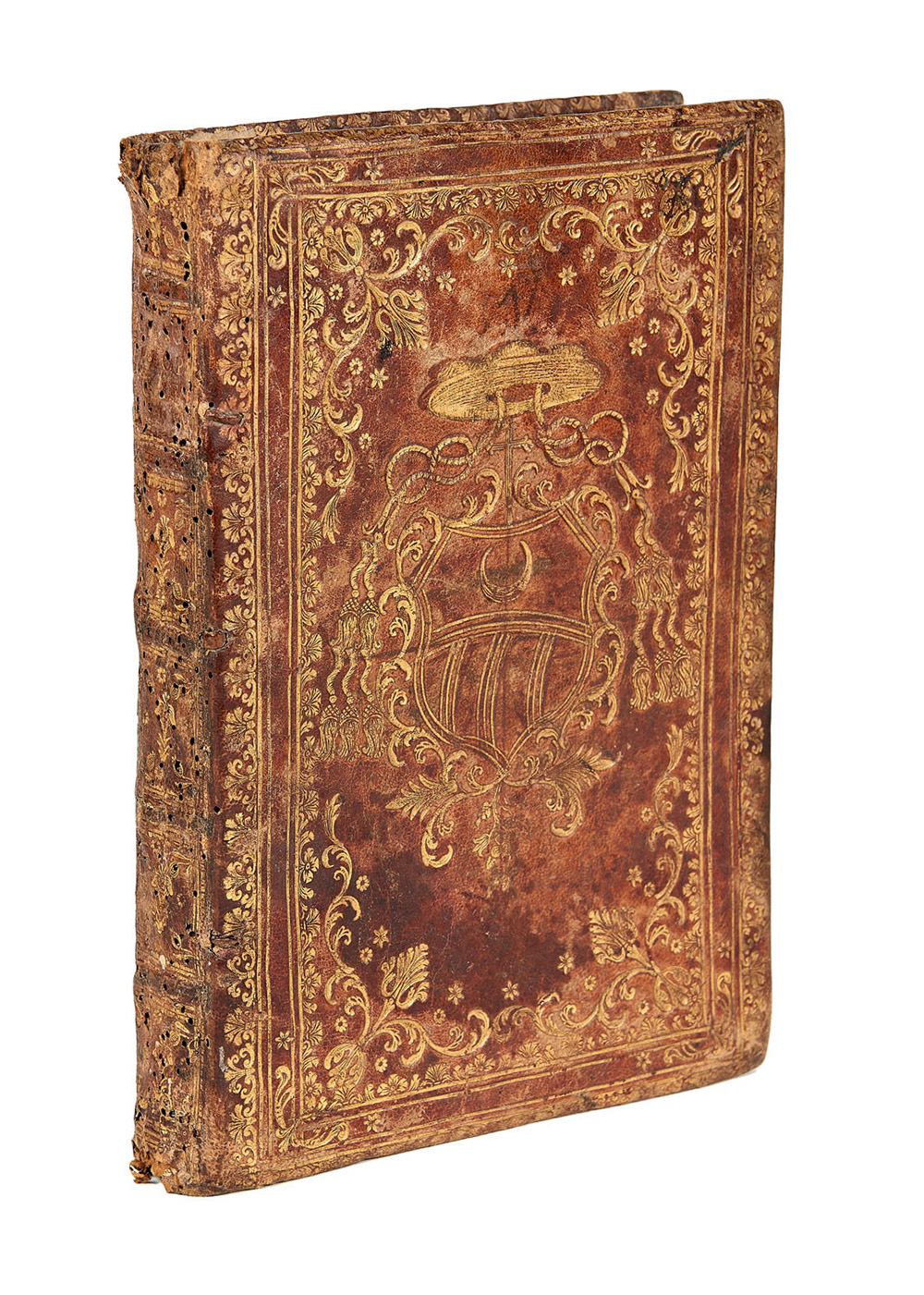 Bella legatura coeva riccamente decorata con stemma vescovile e fregi in oro ai piatti e al dorso.
