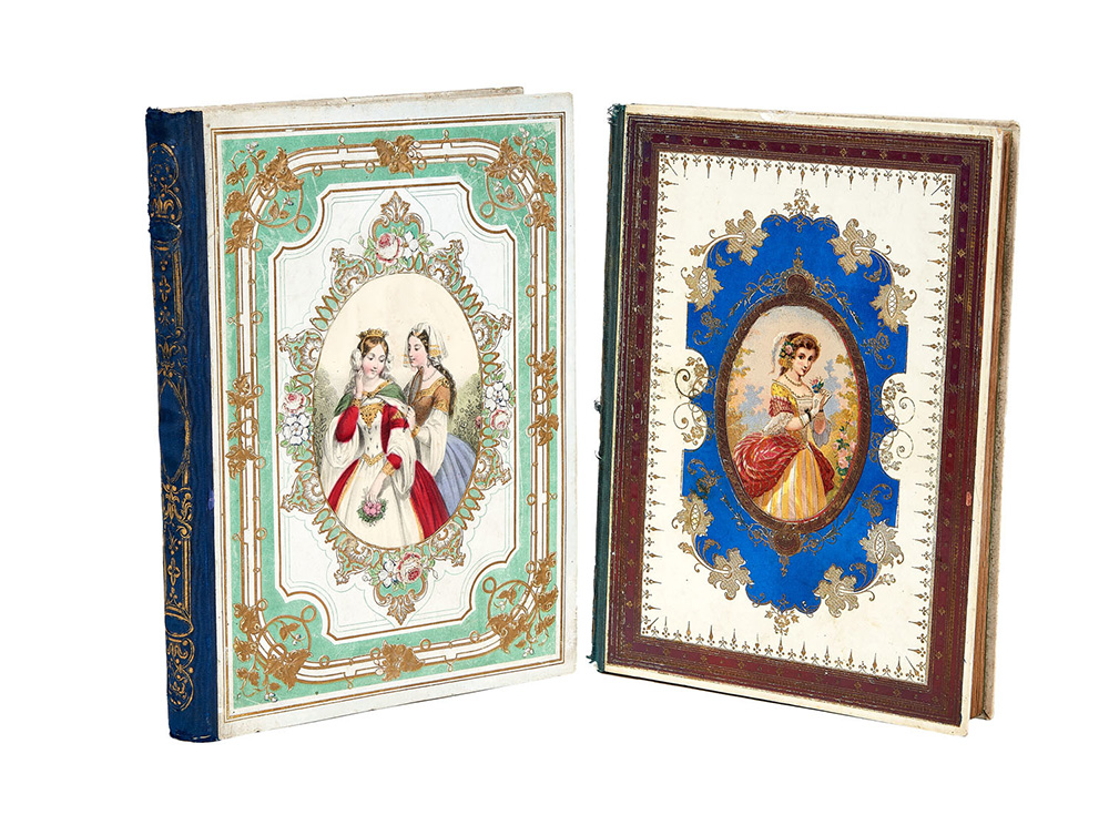 2 opere in 2 volumi, 8vo (265 x 189mm). Bei frontespizi in oro, blu, rosso e verde entro cornici elaborate, testi inquadrati in fregi blu, tavole fuori testo (lievi fioriture). Legature di gusto romantico in tutta carta porcellana con intarsi in oro e a più colori, racchiuse in ovale figure femminili e al verso in rilievo motivi floreali, fregi in oro al dorso tagli dorati (lievi difetti alle legature). (2)