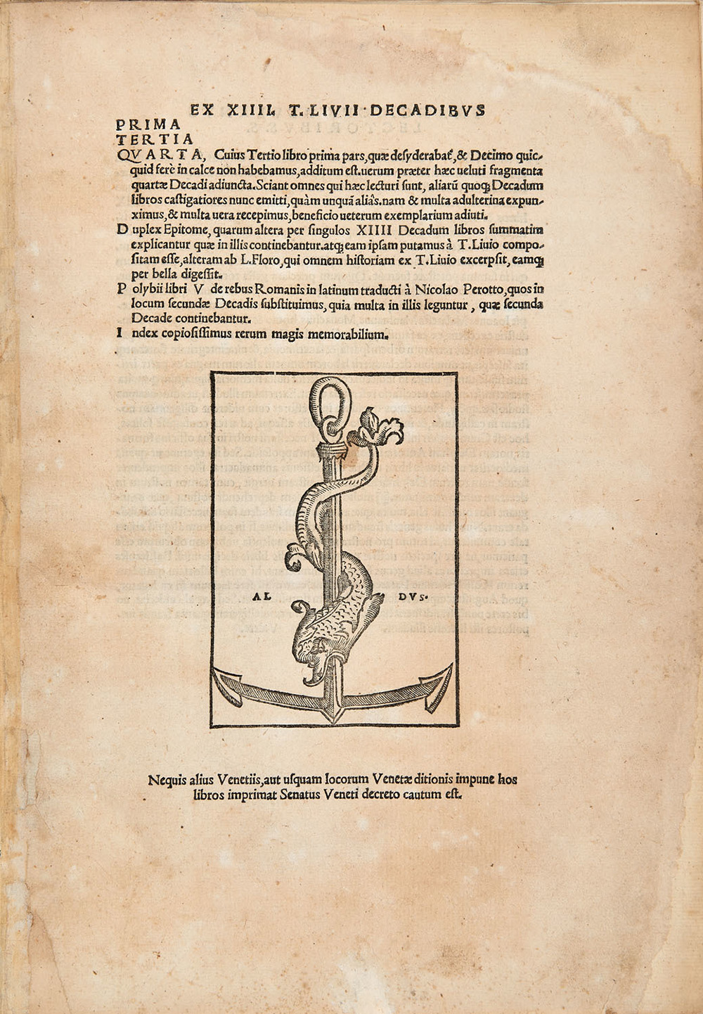 4 parts in one volume, folio (310 x 208mm). 4 parts in one volume comprising: Pt.1: Decas prima; Pt.2: Decas tertia, data del colophon: 1520 mense octobri; Pt.3: Decas quarta, Titi Liuii Patauini decadum 14 epitomae. Lucius Florus, data del colophon: mense Decembri 1520; Pt.4: Polybii historiarum libri quinque in Latiam. Printer's Aldine device on general title, title to each part and at end (first and final leaves reinforces at margins, occasional light spotting, restoration to upper margin). 18th-century tree calf, red morocco spine label, gilt spine. The work has been collated and appears to be complete but it is sold not subject to return.