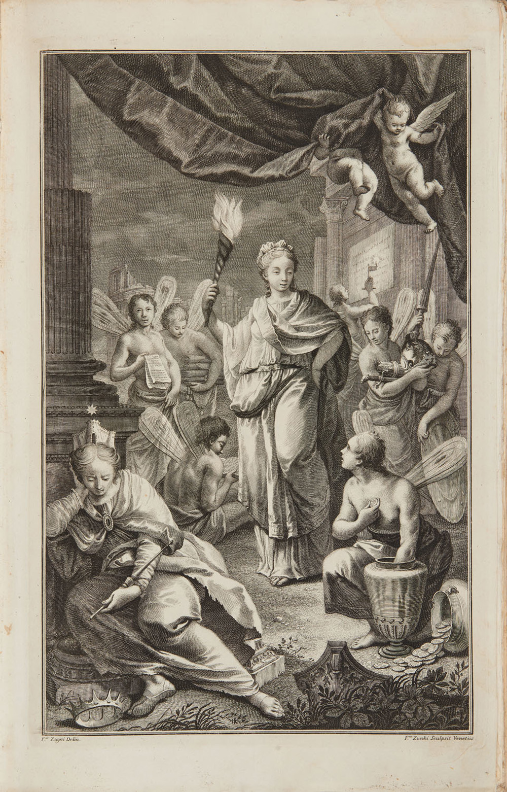 6 volumi, folio (420 x 260mm). Antiporte incise in rame ad ogni volume, testatine xilografiche, numerose illustrazioni nel testo, una carta più volte ripiegata al tomo III (lievi macchie d'acqua). Legatura coeva in pieno cartonato con titoli manoscritti su tassello al dorso. (6)