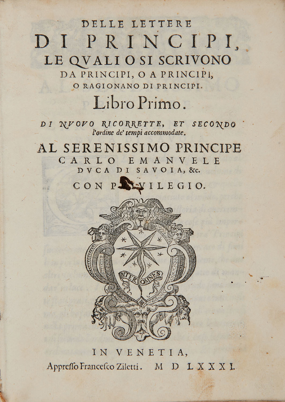 RUSCELLI, Girolamo (1518-1566) - Delle lettere di principi, le quali o si scrivono da principi, o a principi, o ragionano di principi. Libro primo [-terzo]. Venezia: Fracesco Ziletti, 1581.