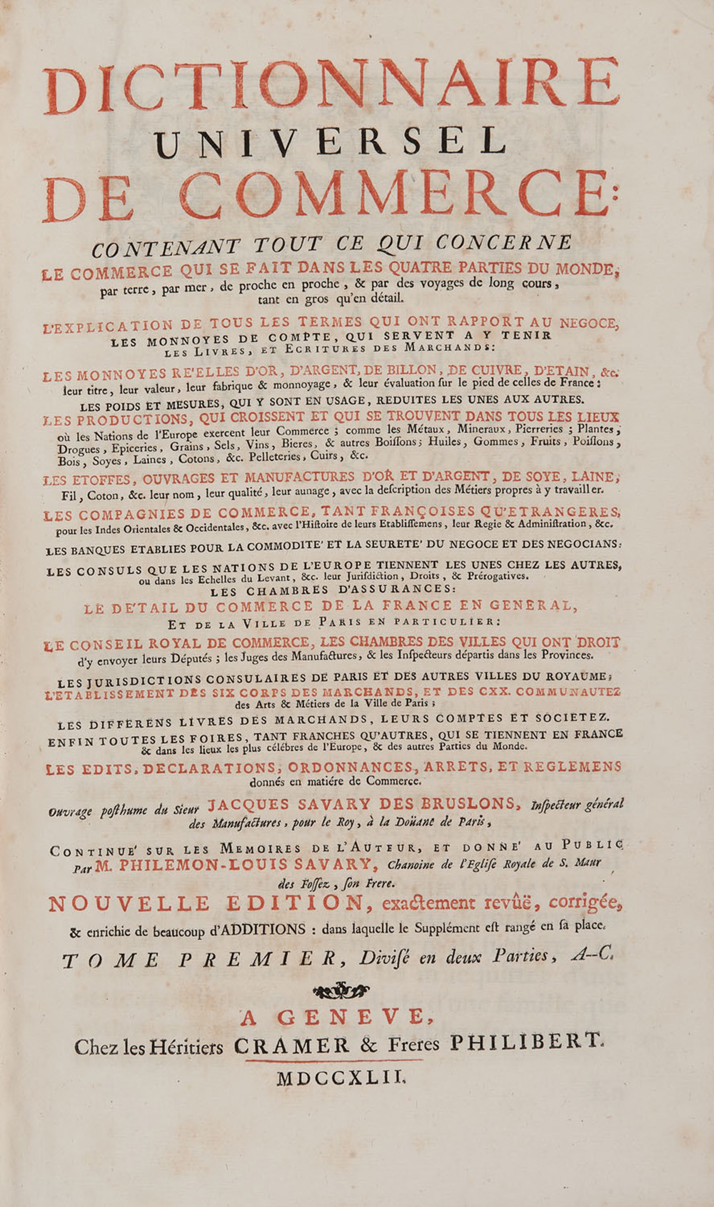 SAVARY DES BRUSLONS, Jacques (1657–1716) - Dictionnaire universel de commerce. Geneva: Cramer e Freres Philibert, 1742.