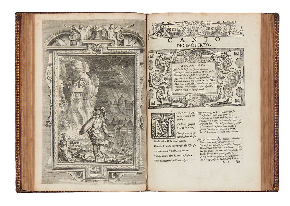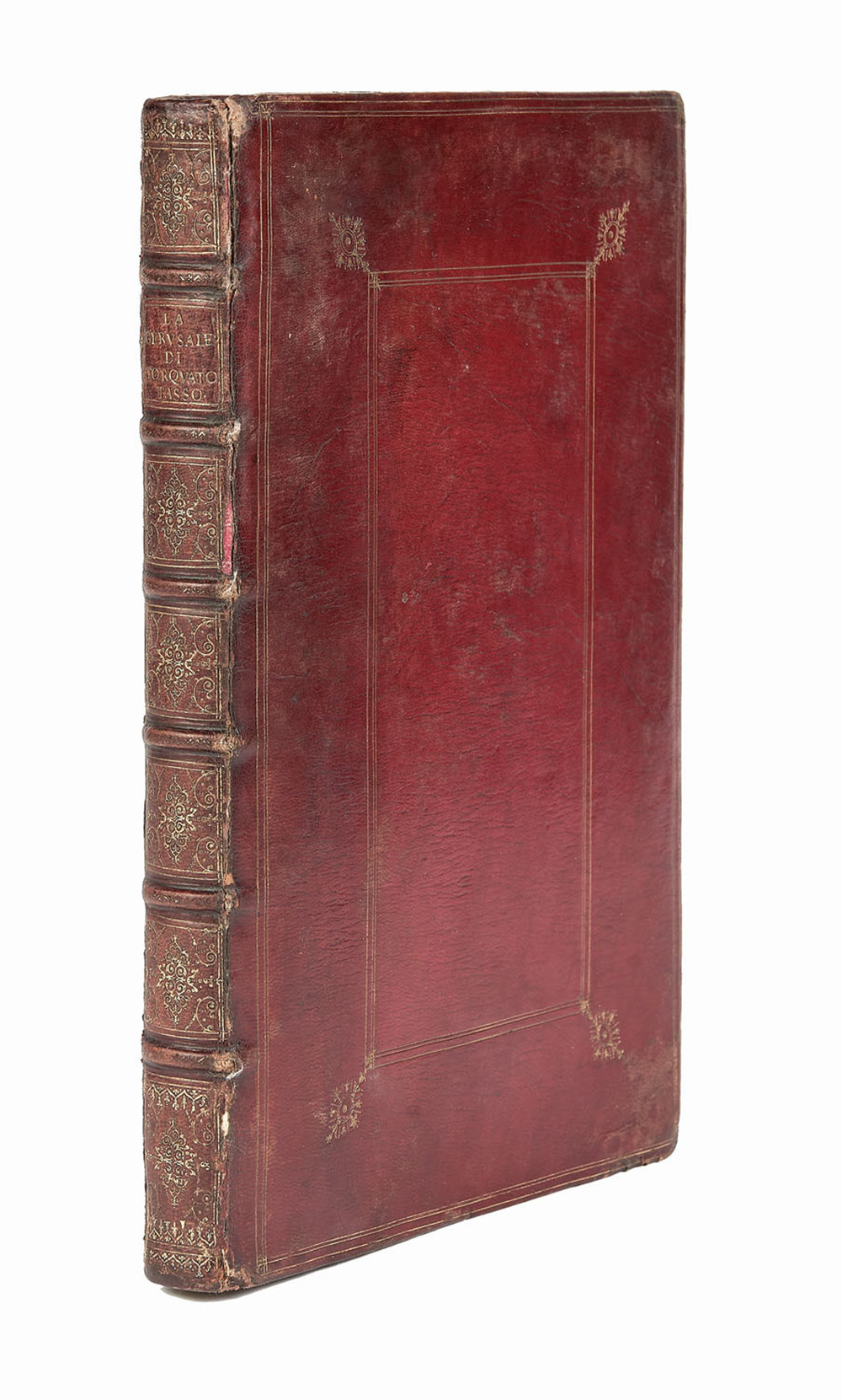 4to (300 x 206mm). Antiporta e frontespizio incisi in rame con i ritratti di Carlo Emanuele di Savoia e Torquato Tasso, 20 tavole a piena pagina entro cornici architettoniche, testatine e ricche cornici con gli argomenti ad inizio di ogni canto, finalini incisi (sporadiche e leggere fioriture). Legatura del XVII francese in marocchino rosso alla Du Seuil, con doppia cornice in oro ai piatti, dorso a 6 nervi con titolo in oro e decori mistilinei, tagli in oro zecchino, unghiature e labbri con dentelli dorati (dorso usurato, piatti leggermente lisi). Provenienza: Sigla G.D.T. (?) al frontespizio; nota di possesso di Patrick Fraser Tytler (1791-1841), Ex libris esq. Mark Dineley; ex libris Allan D. Macdonald.