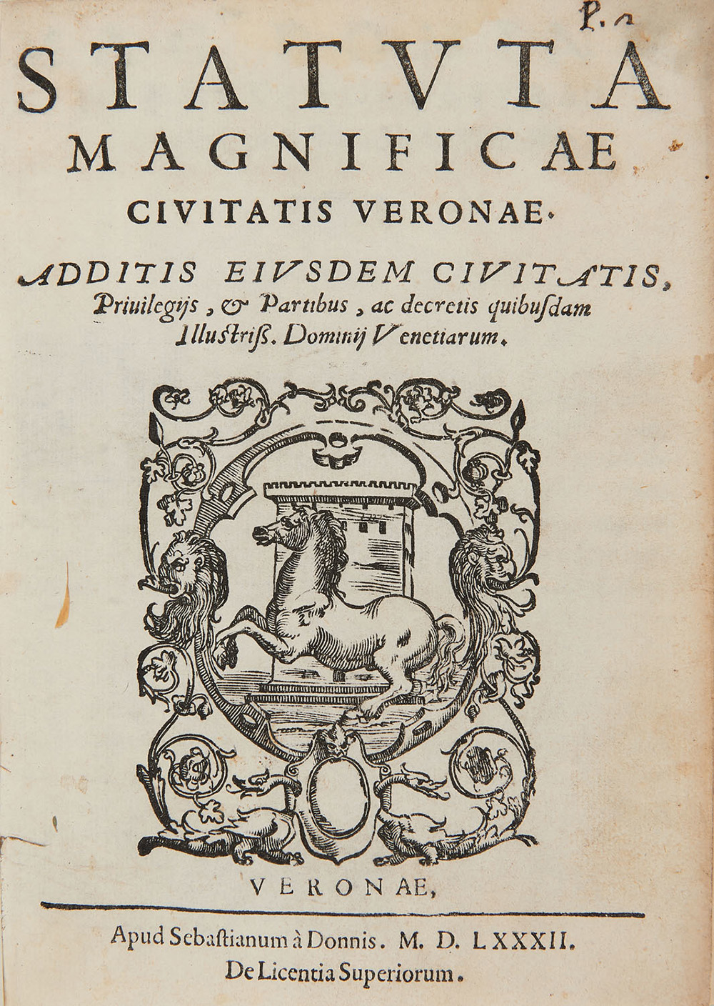 [VERONA] - Statuta magnificae ciuitatis Veronae. Verona: Sebastiano Dalle Donne, 1582.