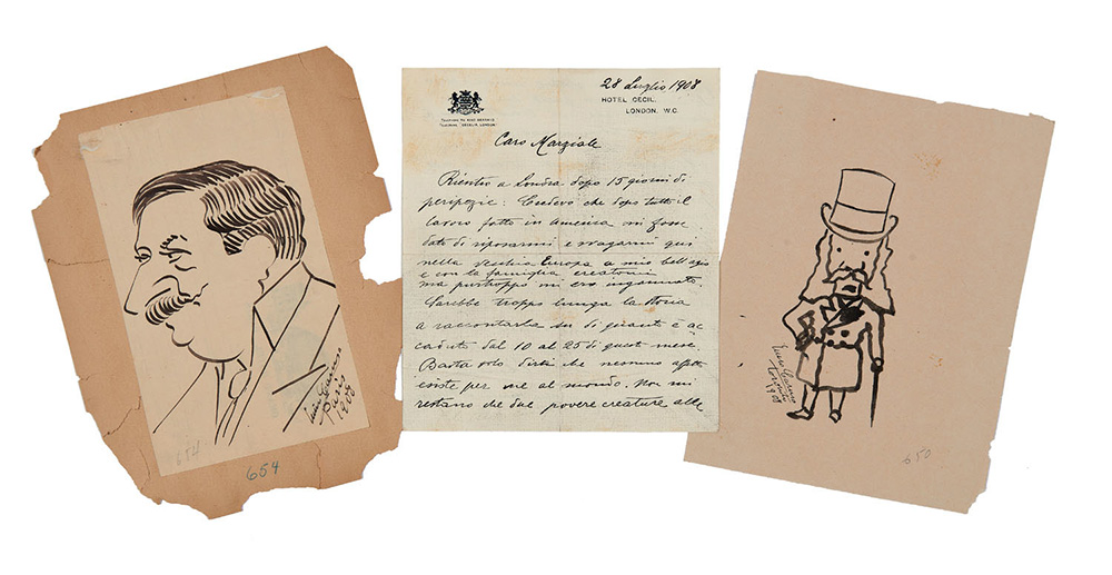 Lettera di Enrico Caruso a Marziale Sisca mandata dall'Hotel Cecil di Londra e datata 28 luglio 1908. Il tenore si rivolge all'amico con toni tristi, lamentando un brutto momento della sua vita in cui "nessuno affetto esiste per me al mondo".. "il mio povero cuore così bruscamente spezzato". Nel lotto anche 2 caricature, forse le stesse che il tenore desidera allegare alla lettera, anch'esse datate 1908. Una lettera su due facciate e due caricature di varie dimensioni. (3).
