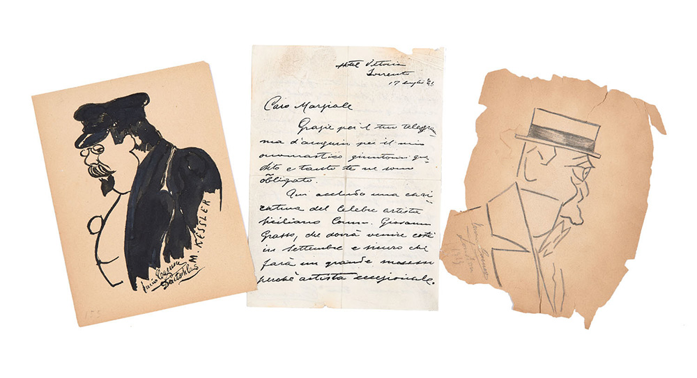 A letter from Enrico Caruso to Marziale Sisca from the Hotel Vittoria dated 1921. Together with two caricatures: the first is an autoportrait dated 1913 and the second an undated portrait of M. Kessler. A letter on 2 pages and two caricatures of different sizes. (3)