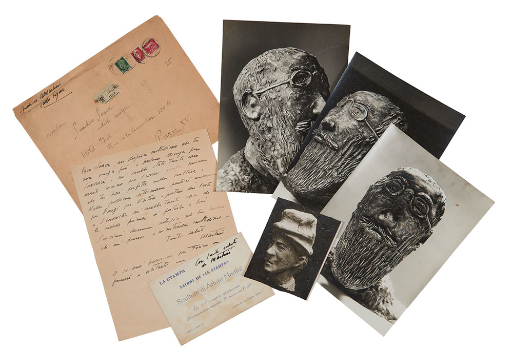 Autograph letter by Arturo Martini addressed to the artist Sandro Soave in Paris in which he discusses the shipment of two sculptures of heads which need to be sent to Paris. In the same lot also 4 black and white photographs of which one inscribed by Martini "il professore Swarz" and an invite inscribed "con tanti saluti da Martini". 4 photographs, an envelope, an autograph letter (280 x 291mm) and an invite (109 x 164mm). (6)