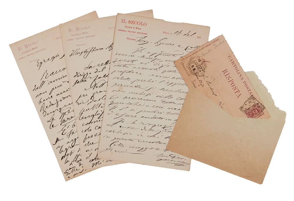 Three letters and a postcard written by Moneta when he was director of the newspaper "Il Secolo". In the letters of 20th October and 1th Novembre 1879 he thanks for the news sent to the newsroom. The letter of 18th December is about a process in which he or the newspaper is involved. The most interesting is the postcard in which the future peace Nobel price lists some authors that wrote against the creation of a permanent army. Three letters on "Il Secolo" letterhead paper and a postcard. (5)