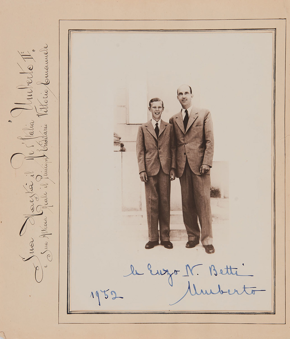 Fotografia di Umberto II insieme al principe ereditario Vittorio Emanuele firmata "Umberto" 1952. Sul retro un dattiloscritto di Mario Castellani con firma autografa in cui presenta le fotografie al "Signor Betti!", "sua Maestà" il 31 marzo 1952. Foto (235 x 173mm) in passepartout.