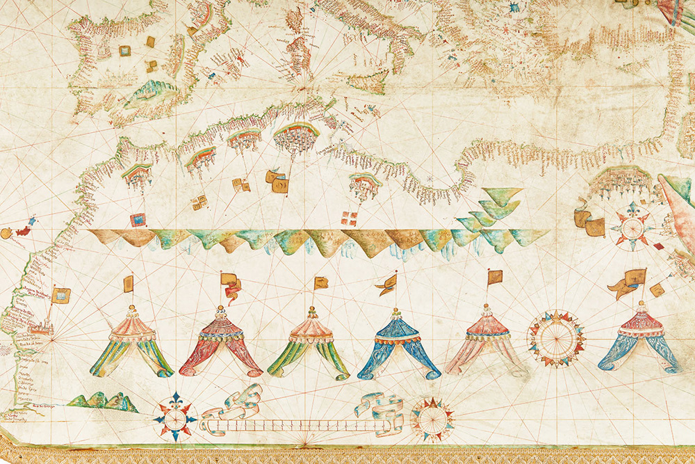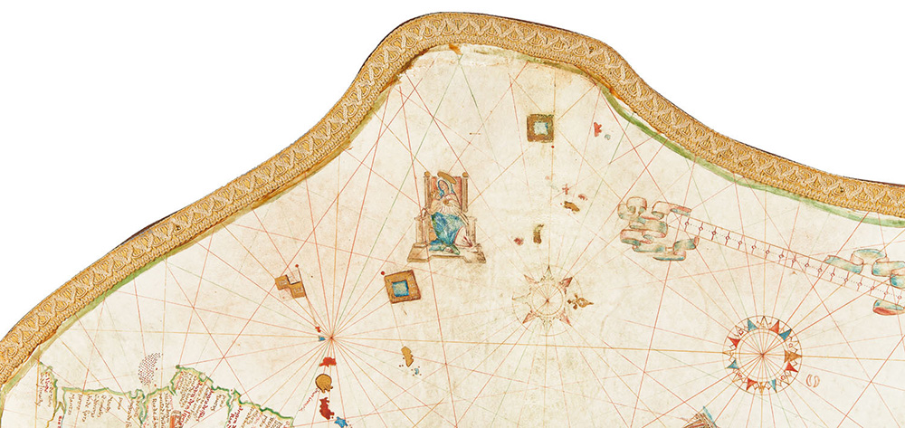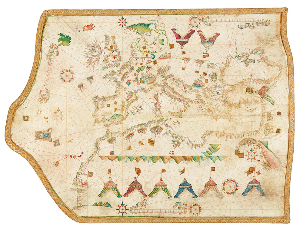 Straordinaria carta nautica manoscritta su pergamena, miniata e decorata anche in oro. L'esemplare è attribuibile al circolo di Vesconte Maggiolo, il più importante cartografo genovese del XVI secolo. Sono illustrate l'Europa, il nord Africa con in evidenza i monti dell'Atlante, l'Oceano Atlantico con le isole Canarie, i confini nordici con Islanda, Svezia e Norvegia, il Mar Rosso al confine sud-est e nel dettaglio le città portuali del Mar Mediterraneo rilevanti all'epoca. La carta è decorata con 8 rose dei venti, una Madonna in trono, 8 tende, 28 vignette di città fra cui le grandi città portuali di Venezia e Genova, ognuna con la propria bandiera identificativa.