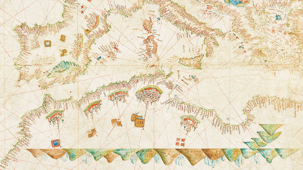 Le carte portolane prendono il loro nome dalla parola "porto" e illustrano appunto le città portuali lungo le coste. Le prime furono prodotte nel XIII secolo e rappresentano un fondamentale cambiamento nell'uso delle carte geografiche; fino a quel momento le mappe avevano quasi sempre avuto un significato religioso e non pratico, invece le carte portolane vanno in contrasto con questa tradizione e si basano sull'osservazione diretta con un ben preciso scopo pratico: quello di navigare. A rifletterne l'effettivo utilizzo in mare sono i dettagli delle descrizioni costiere, in contrasto invece con l'omissione talvolta totale dei territori interni, anche quando vi sarebbero città importanti da mettere in evidenza. I toponimi portuali sono scritti alla giusta angolazione rispetto all'andatura costiera e i porti più importanti sono evidenziati dal colore rosso. Alla fine di tutto sono poi stati tracciati i rombi di vento.