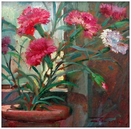 OVIDIO GRAGNOLI Grosseto 1893 – Firenze 1953 Garofani Olio su cartone 28 x 29. Firma in b. a d., titolo sul verso. base: 100