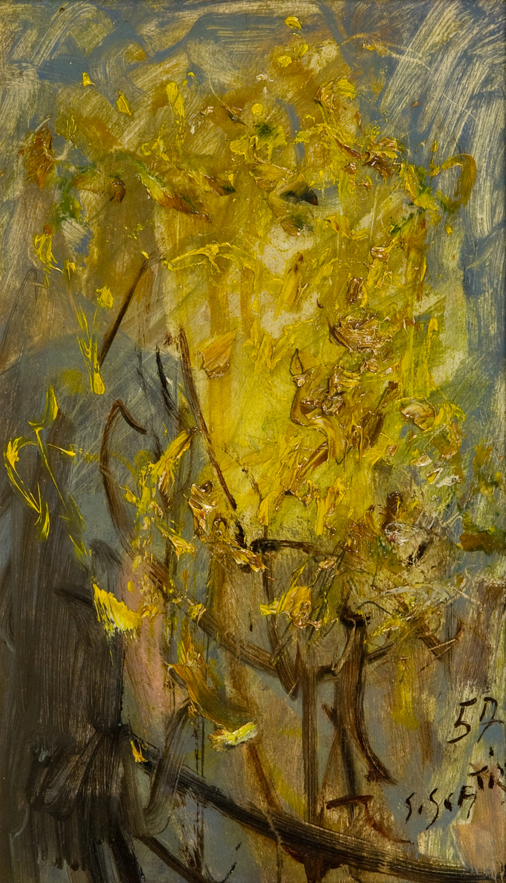 Sergio Scatizzi Senza titolo, 1957 Olio su faesite, cm. 39x23,5 Firma e data in basso a destra. Sul verso: dedica a persona.