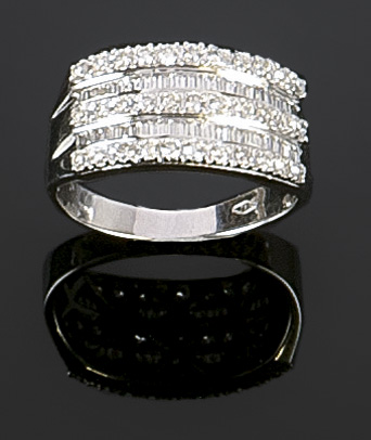 ANELLO Anello in oro bianco, a fascia, con cinque file di diamanti taglio brillante rotondo e baguette per complessivi ct 1,60 ca Peso gr. 6,00 Misura 20