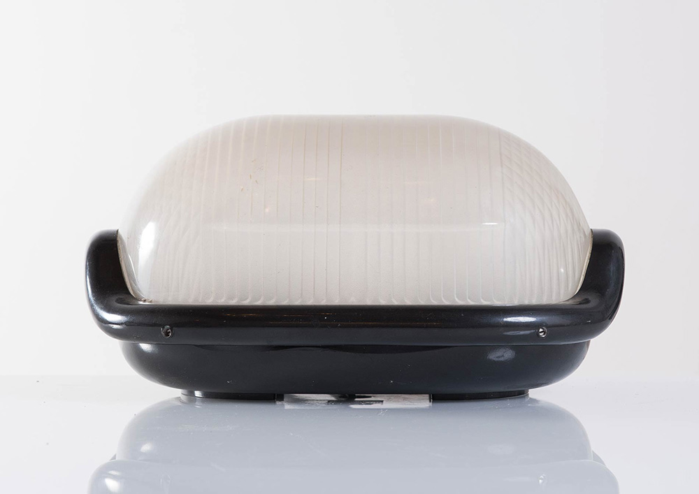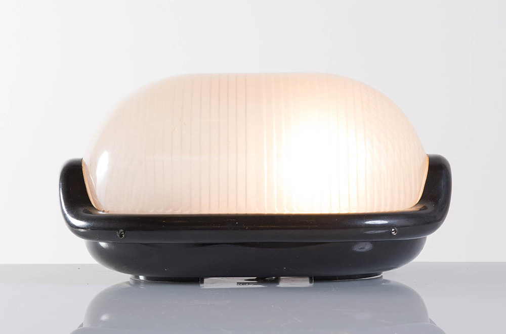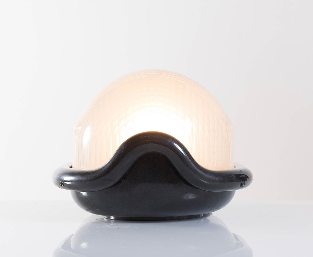 Achille Castiglioni (1918 – 2002), “Noce”, Produzione Flos, 1972. Lampada da tavolo, struttura in metallo laccato nero, diffusore in vetro lavorato a stampo, marchio sotto la base FLOS, H cm 19x36x26 (usure)