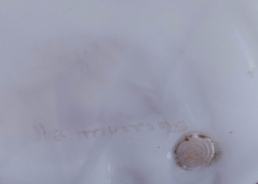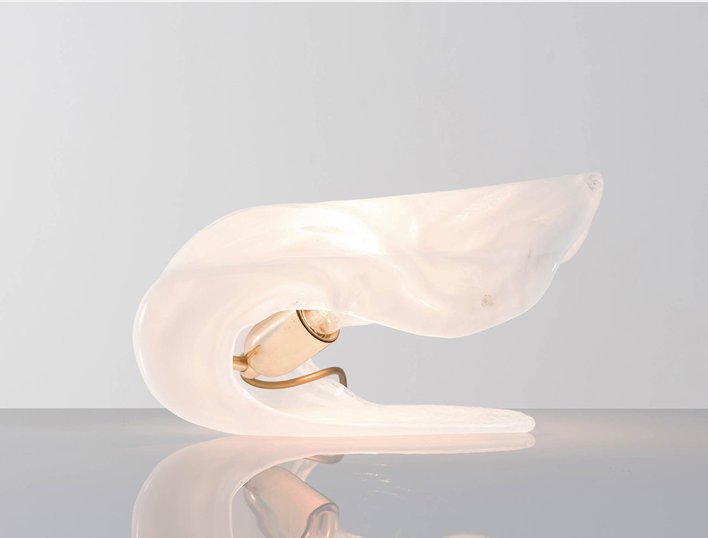 Lampada da tavolo a conchiglia, Produzione La Murrina, Anni ‘80. Vetro bianco e trasparente, reca firma della manifattura incisa, H cm 17x32x19 (usure) Bibliografia: Pubblicità da Rivista dell’epoca.