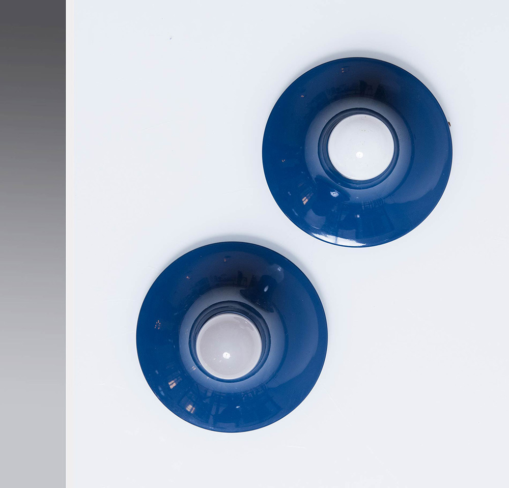 Vico Magistretti (1920 – 2006), “Teti”, Produzione Artemide, Anni ‘70. Coppia di appliques con struttura in plastica blu, recano marchio della manifattura sotto la base ARTEMIDE, H cm 8 - diametro 14.5 (usure)