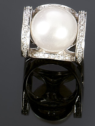 ANELLO Anello in oro bianco composto da quattro anse con diamanti taglio brillante rotondo per complessivi ct 0.58, trattenenti al centro una perla australiana di forma sferica del diam. di mm 16,40 Peso gr. 27,5 Certificato di analisi R.A.G. n. P021/5N rilasciato in data 30/09/2005 Radiografia della perla