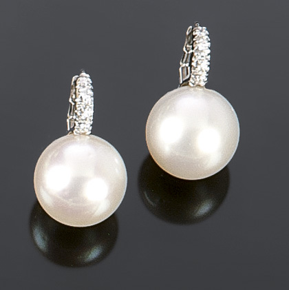 COPPIA DI ORECCHINI Coppia di orecchini in oro bianco, a monachella, con due perle australiane del diam. da mm 14,2 a 14,4, di colore bianco, elemento rigido in diamanti taglio brillante rotondo per complessivi ct 0,16 ca Peso gr. 11,5