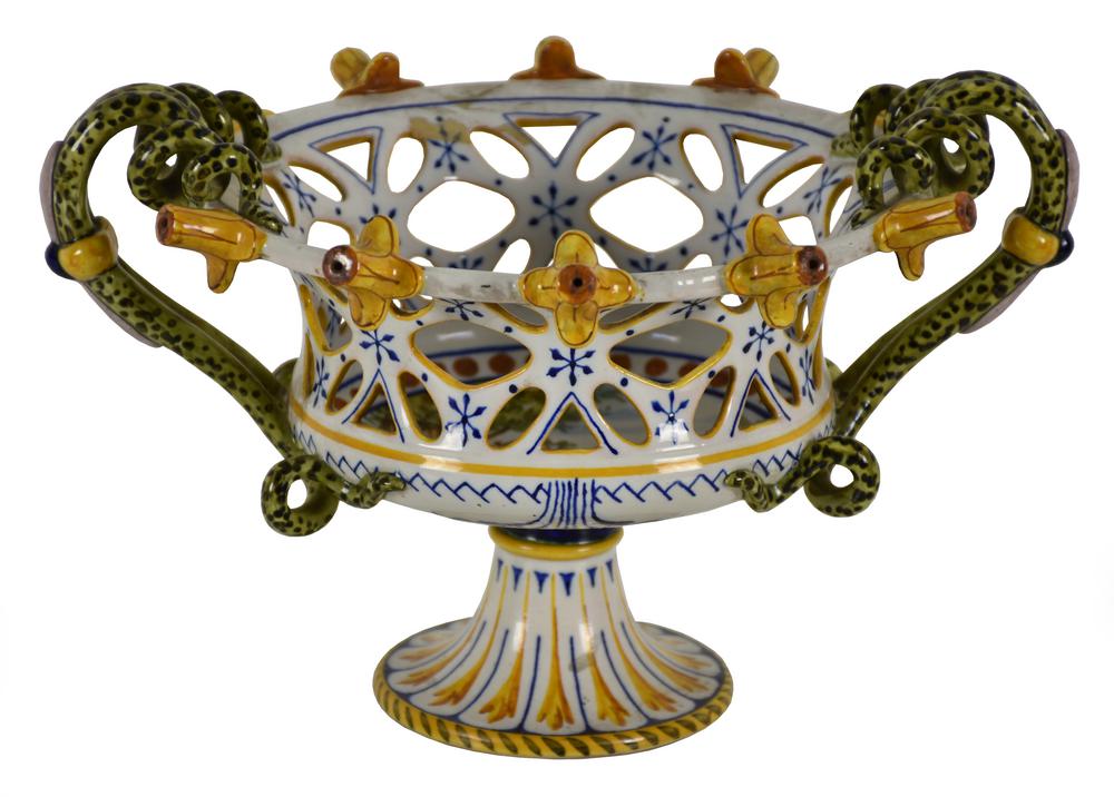 Alzata centrotavola manifattura Ginori, fine secolo XIX in ceramica policroma, anse a serpenti, vasca traforata dipinta con due puttini alati, altezza cm 16 Lievi danni