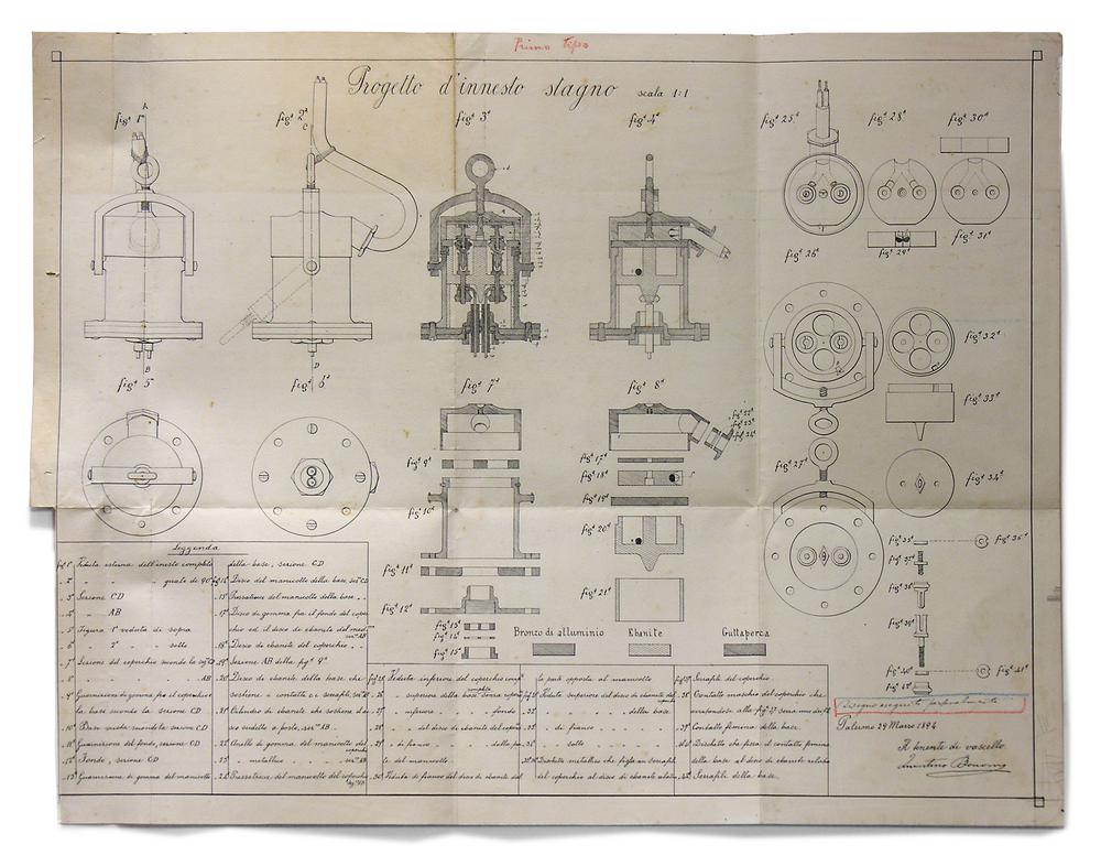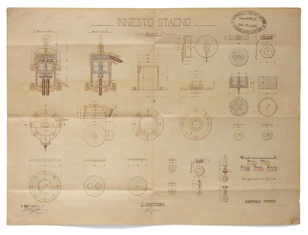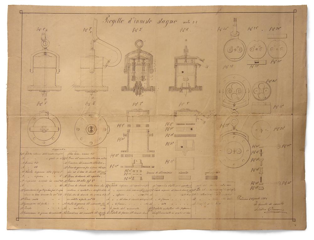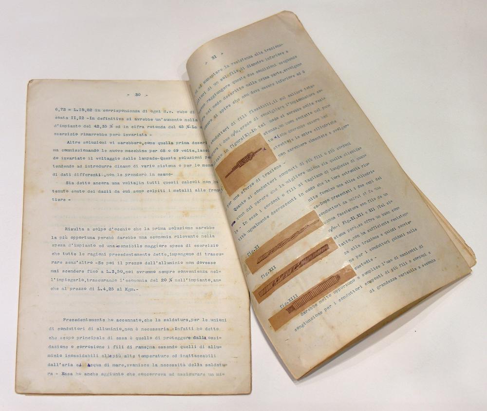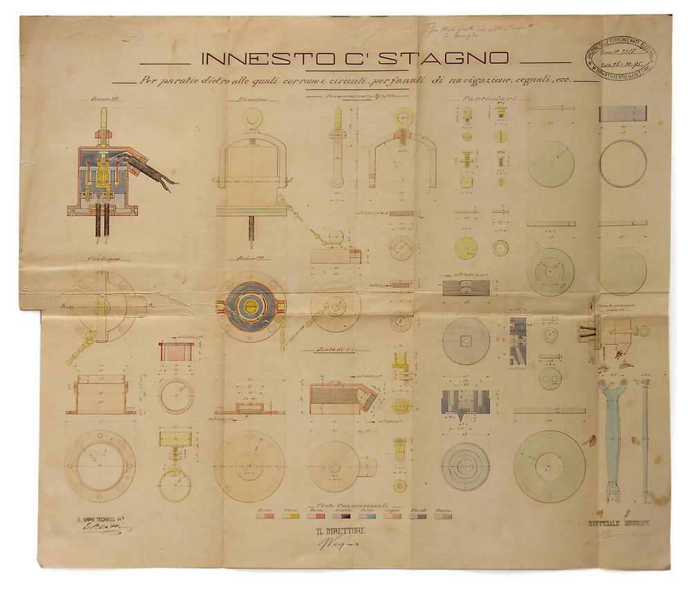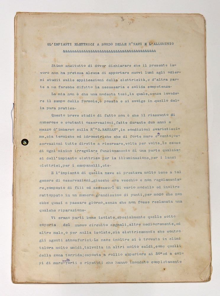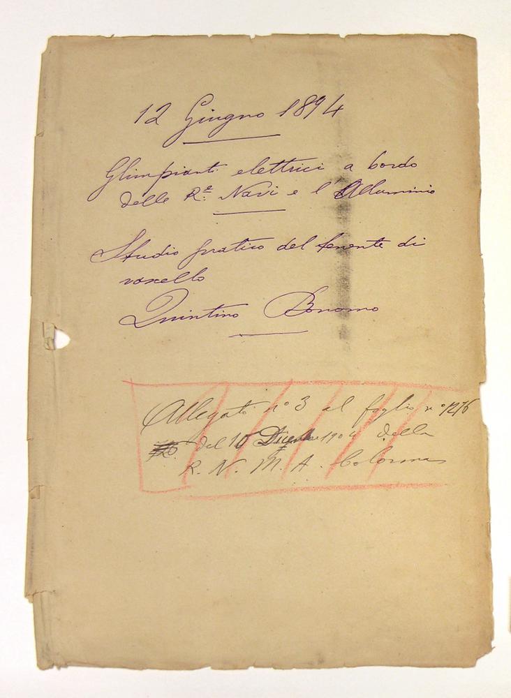 Quintino Bonomo Capitano di Fregata e Tenente di Vascello Progetto per gli impianti elettrici a bordo delle Regie Navi e l’Alluminio Aprile 1894 Progetto originale composto da: - Carteggio esplicativo del progetto declinato in 40 pagine dattiloscritte; - 4 tavole originali formato cm 65x50 circa