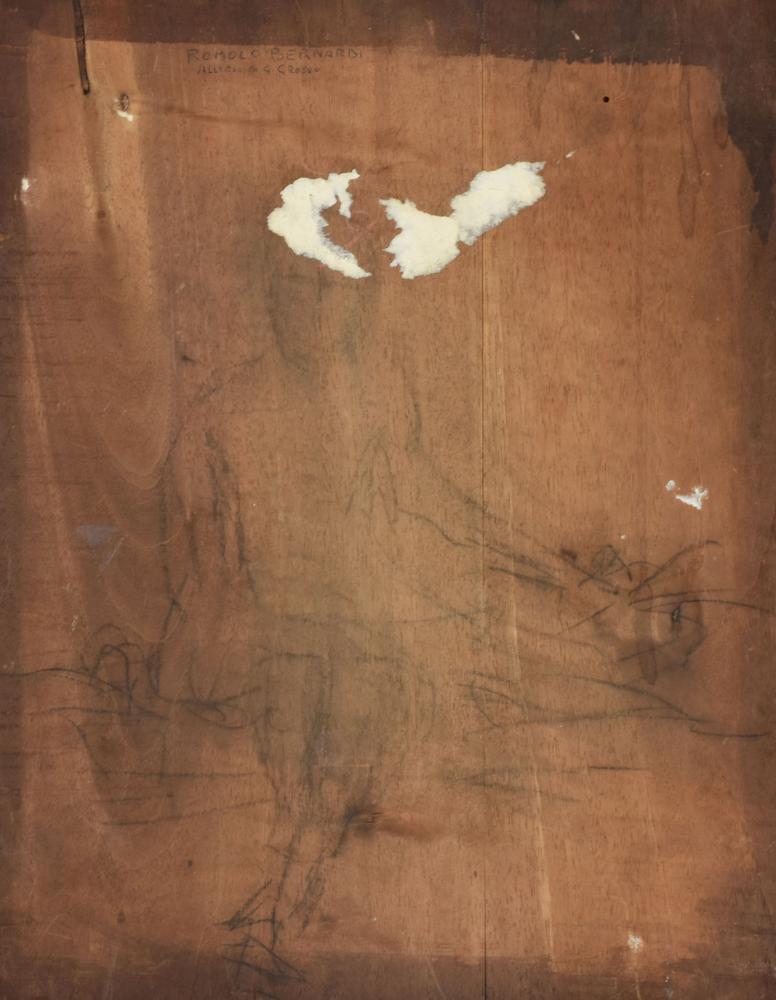 Romolo Bernardi VOLTO FEMMINILE olio su tavola, cm 37,7x30,2 sul fronte: firma L'opera presenta un disegno sul retro della tavola