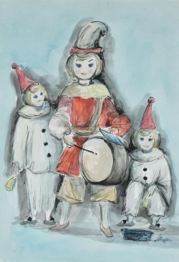Leonardo Stroppa TAMBURELLO E PIERROT acquarello su carta, cm 54x38 sul fronte: firma
