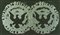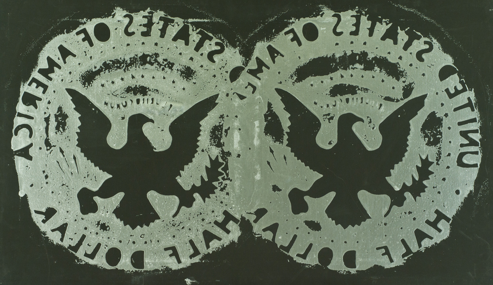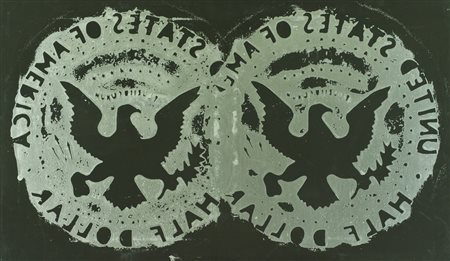 Franco Angeli Half dollar, 1983 Smalto su tela, cm. 70x120 La tela presenta lievi imperfezioni dovute al tempo. Sul verso: firma; Etichetta "Galleria d'Arte Giacomo Cesari", Ferrara, con descrizione. Autentica di Angiolino Calestani su foto, con timbro a secco e Archivio n° P.P.1523.