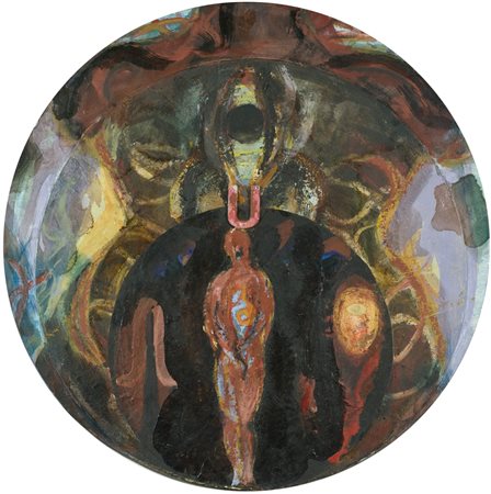 Bruno Ceccobelli Sarai chiamata Tecnica mista su tavola, diametro cm. 57 Sul verso: firma e titolo. Autentica dell'Artista su foto, con Archivio n° LIB27DA.