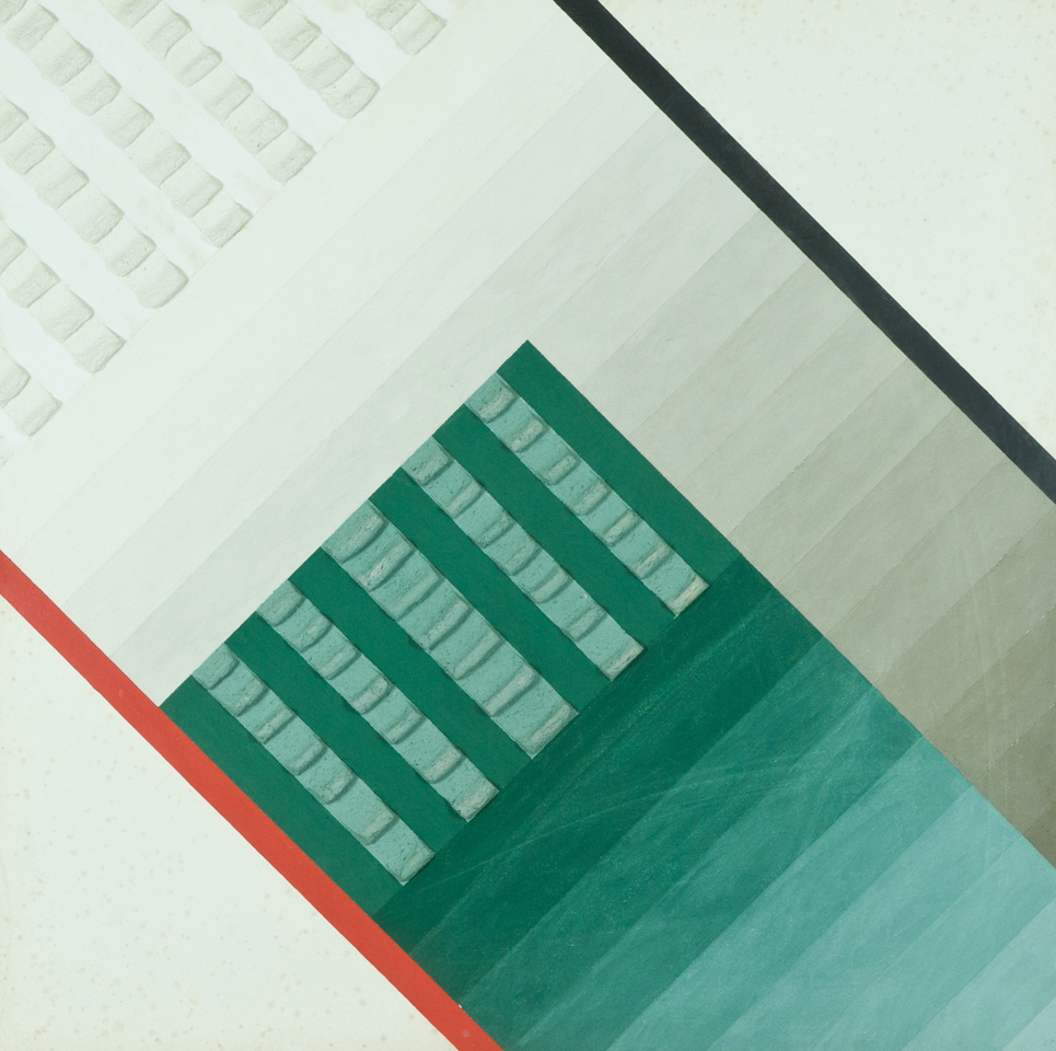 Giancarlo Bargoni Espansioni simultanee A, 1965 Tecnica mista su tela, cm. 65x65 La tela presenta macchie di umidità. Sul verso: firma, data e titolo; Etichetta e timbro "Galleria d'Arte R. Rotta", Genova; Etichetta "Premio San Fedele, 1965".