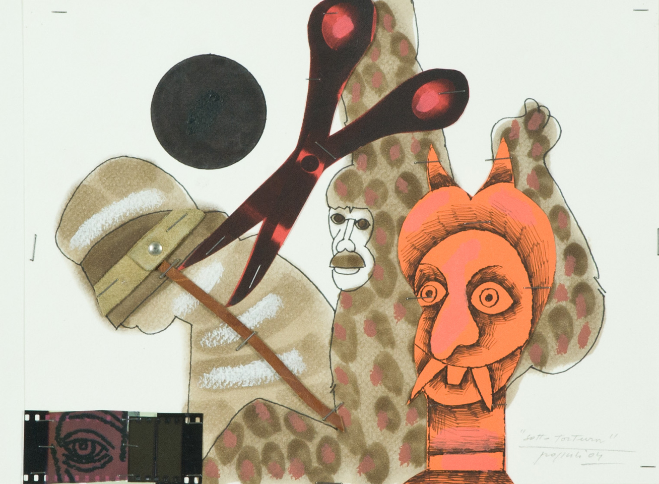 Concetto Pozzati Sotto tortura, 2004 Tecnica mista su carta, cm. 24x32 Firma, data e titolo in basso a destra. Bibliografia: Maria Paola Poponi "Concetto Pozzati Archivio Generale - IV Tomo", Maretti editore, 2012, pag. 165, Archiviato con il n° 2218. Autentica dell'Archivio Generale Concetto Pozzati su foto con Archivio n°2218/11.