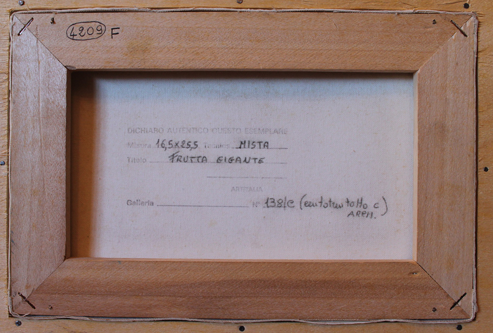 Norberto Proietti, Frutta gigante, Mista su tela, 16cm x 25cm. Archivio generale sul retro tela 138 C confermato telefonicamente