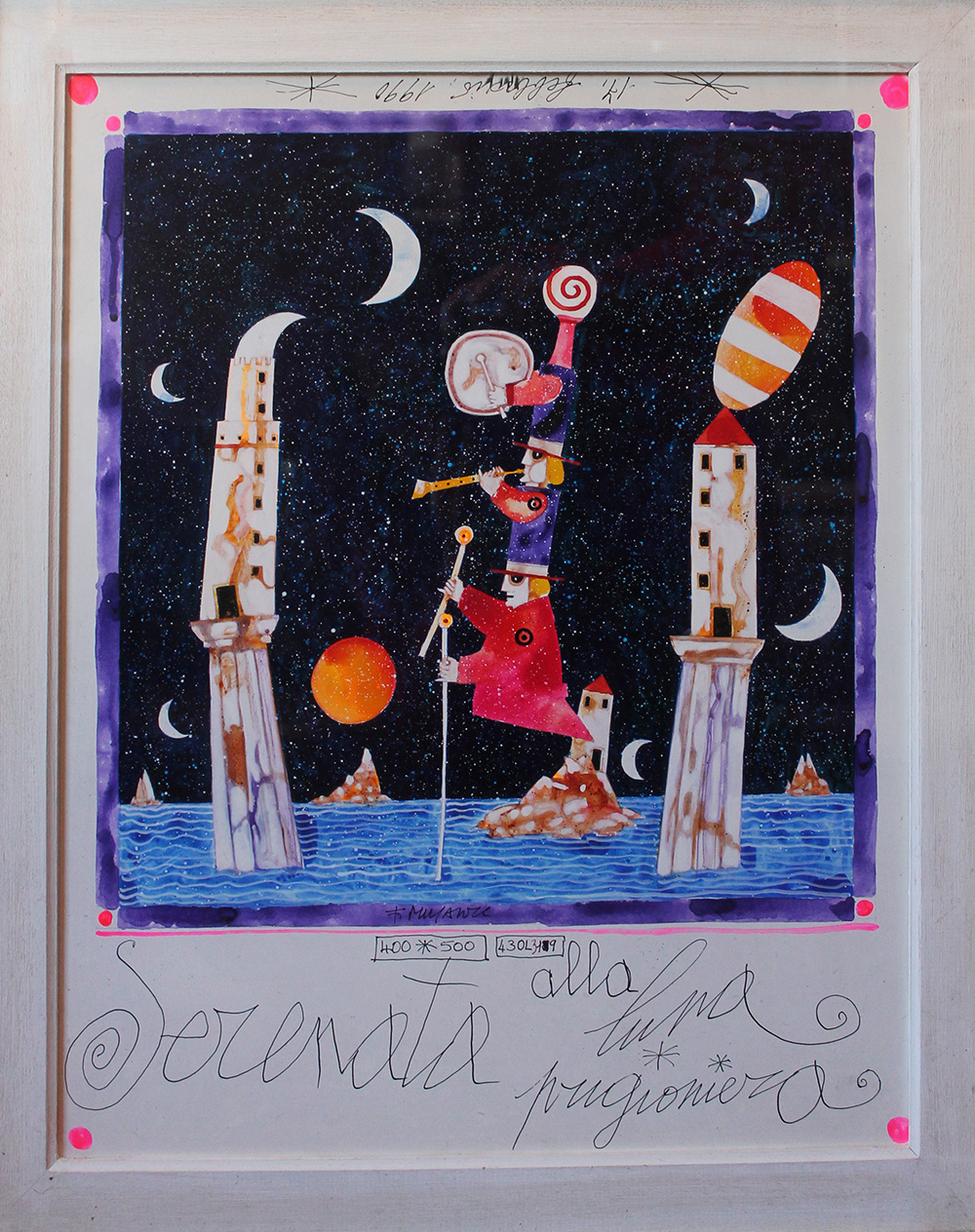 Lotto 105 | Francesco Musante, Serenata alla luna prigioneria, Tecnica mista su masonite,...
