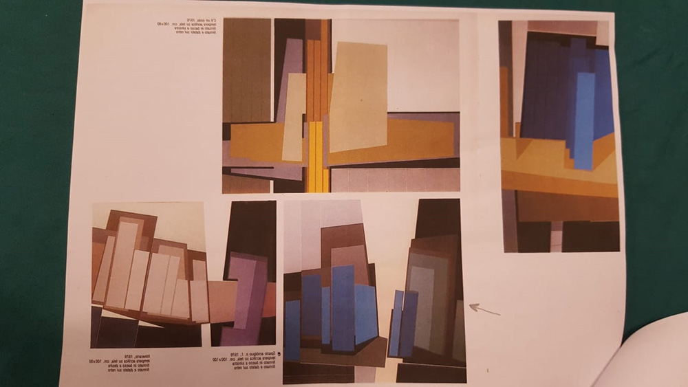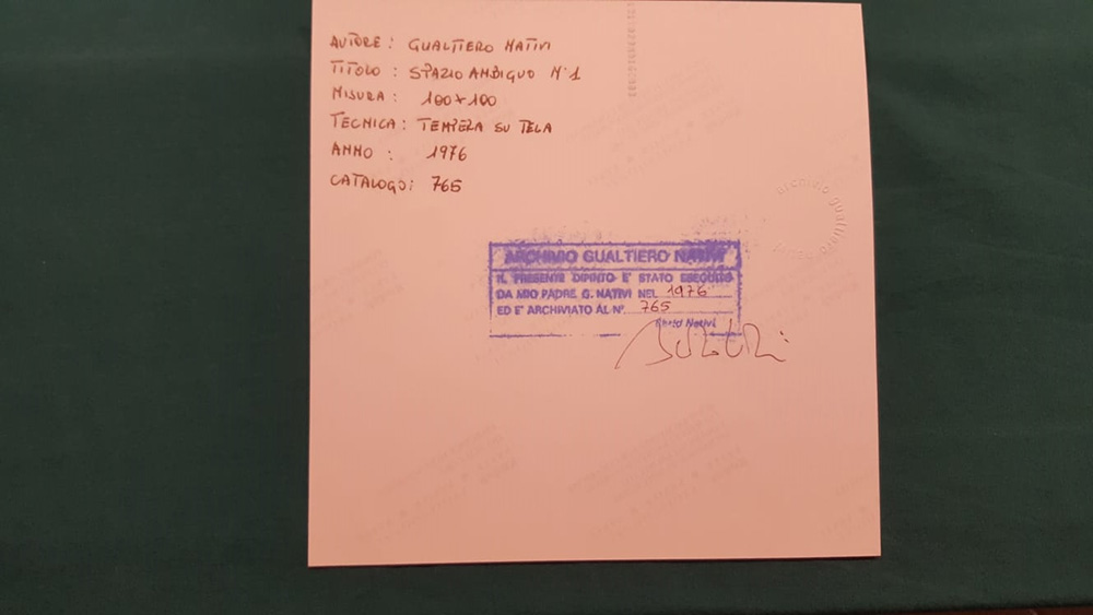 Gualtiero Nativi, Spazio ambiguo numero 1, 1976 Tempera su tela, 100cm x 100cm. Autentica su foto dell'artista e pubblicato su catalogo generale