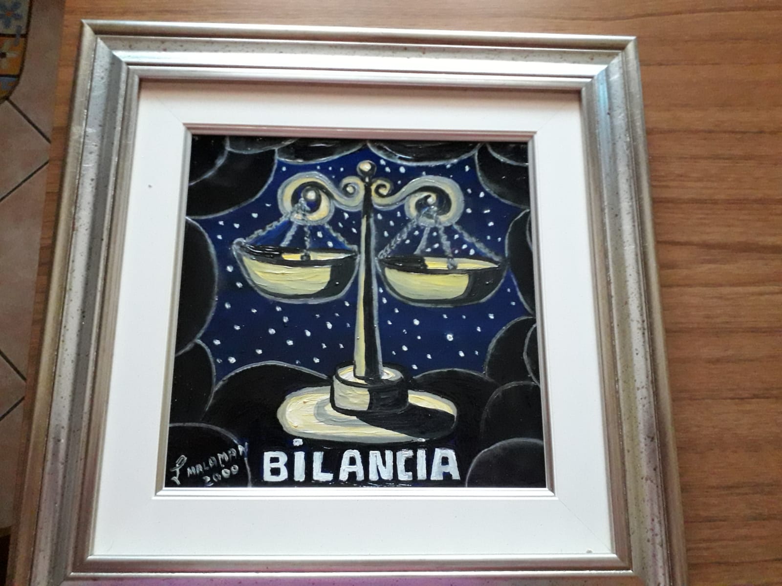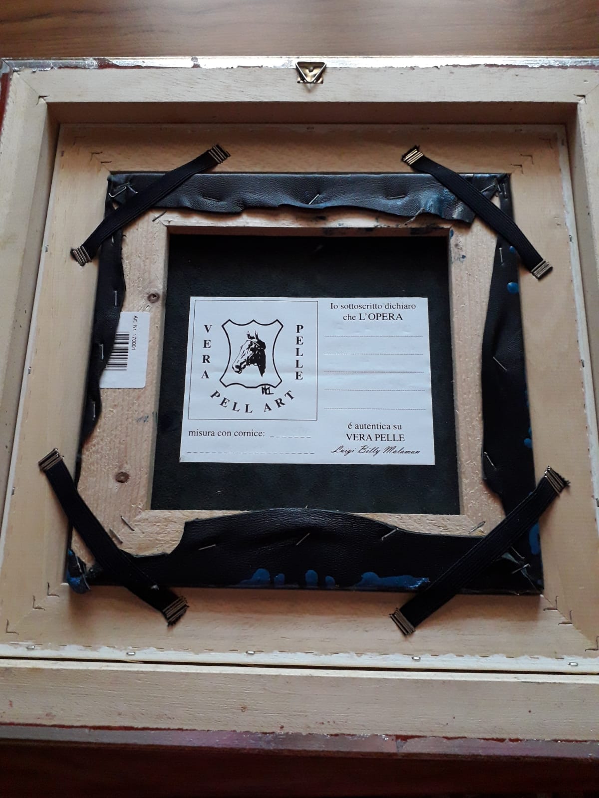 Luigi "Billy" Malaman, Bilancia, 2000 Tecnica mista su vera pelle, 40cm x 40cm. Pubblicato su volume Luigi "Billy" Malaman il Pittore dei Reali di Spagna