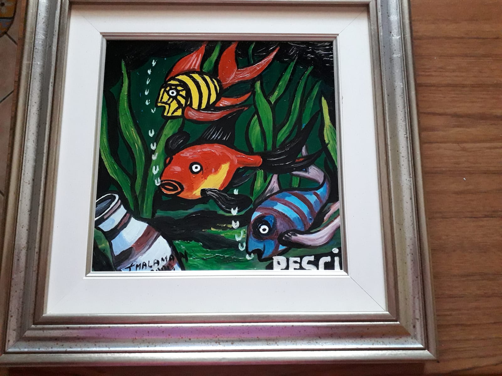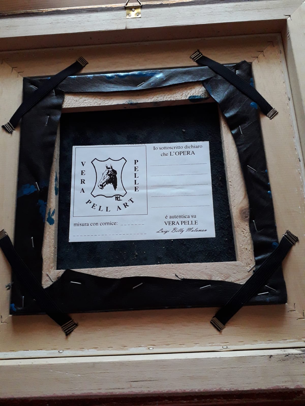 Luigi "Billy" Malaman, Pesci, 2000 Tecnica mista su vera pelle, 40cm x 40cm. Pubblicato su volume Luigi "Billy" Malaman il Pittore dei Reali di Spagna