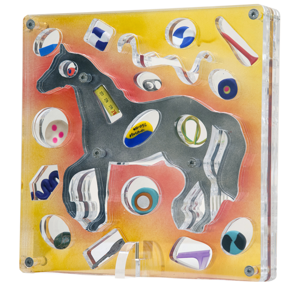 Renzo Nucara Stratofilm (Cavallo), 2011 Plexiglass, resine ed oggetti, cm. 30x30x5 Firma e data al centro. Autentica dell'Artista con foto e Archivio n° 011 - 056.