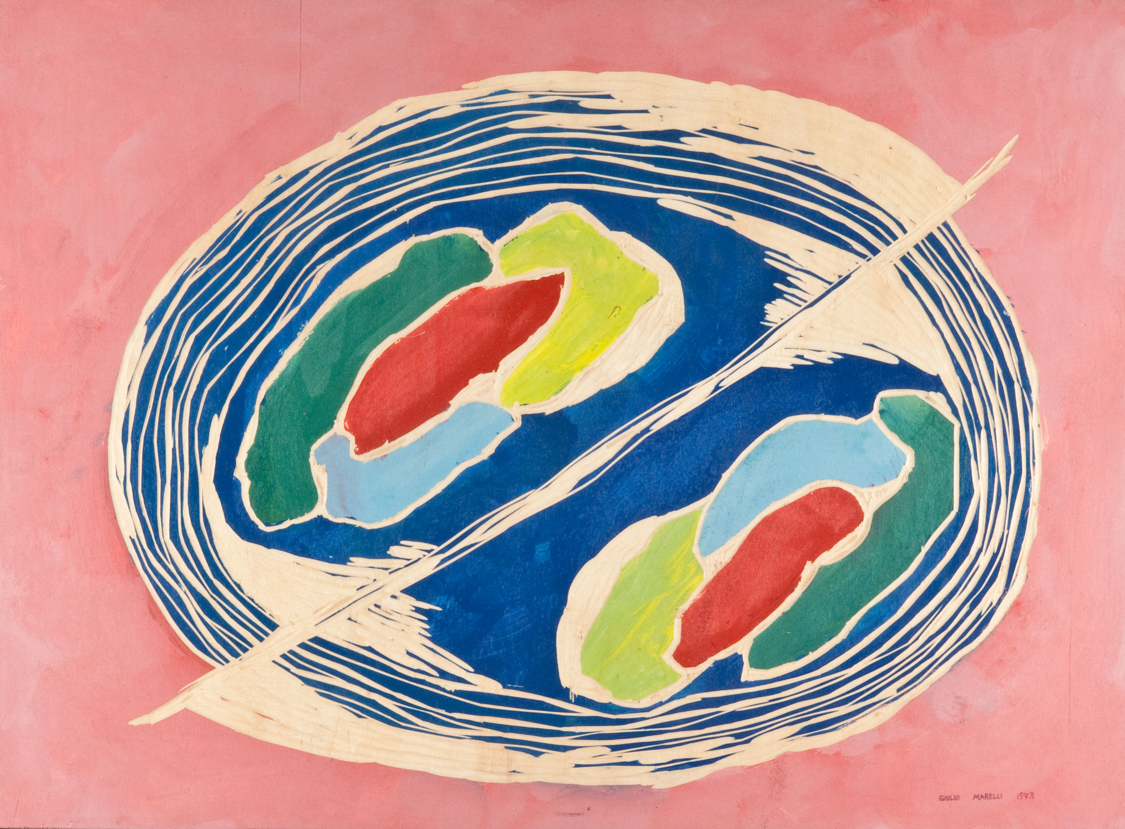 Giulio Marelli Senza titolo, 1973 Olio su tavola incisa, cm. 59x80 Firma e data in basso a destra. Sul verso: timbro "Galleria Giraldi", Livorno e sigla "Bruno Giraldi".